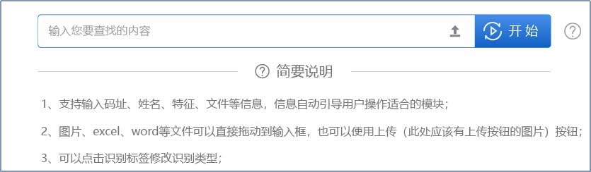 建設(shè)統(tǒng)一入口界面,實(shí)現(xiàn)用戶的多種輸入方式,包括但不限于各類(lèi)碼址、名稱(chēng)、地址、特征片段、數(shù)據(jù)文件、文檔文件等。支持通配符方式;支持中英文兩個(gè)語(yǔ)種的輸入支持和判斷,支持中英文混合輸入;支持多條信息或文件的輸入。
